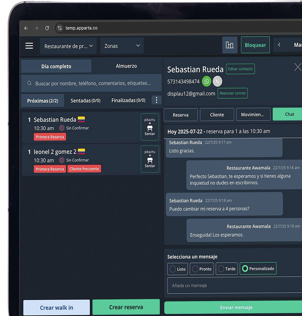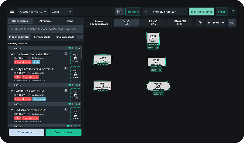 Algoritmo IA de autoasignación de mesas, creación de fechas y zonas especiales, etiquetas personalizadas para cada comensal, limitaciones y bloqueos ajustados a la medida de tu restaurante, utilizanos desde celular, tablet, o computador.